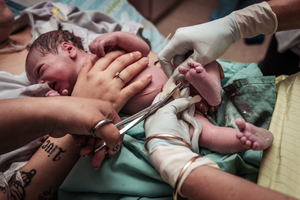 לאחר הלידה, התינוק מתחיל לנשום עצמונית ומבוצע חתך של חבל הטבור אבל חלקים ממנו נשארים בגוף היילוד, בתוך מעטפת הבטן שלו (פריטונאום).